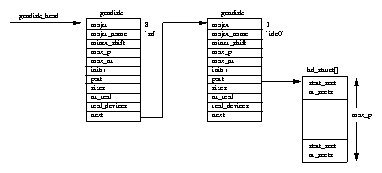 During initialization Linux maps the topology of the hard disks in the system. It finds out how many hard disks there are and of what type. Additionally, Linux discovers how the individual disks have been partitioned. This is all represented by a list of gendisk data structures pointed at by the gendisk_head list pointer. As each disk subsystem, for example IDE, is initialized it generates gendisk data structures representing the disks that it finds. It does this at the same time as it registers its file operations and adds its entry into the blk_dev data structure. Each gendisk data structure has a unique major device number and these match the major numbers of the block special devices. For example, the SCSI disk subsystem creates a single gendisk entry (``sd'') with a major number of 8, the major number of all SCSI disk devices. Figure 8.3 shows two gendisk entries, the first one for the SCSI disk subsystem and the second for an IDE disk controller. This is ide0, the primary IDE controller.
