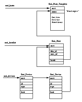 First, Linux finds out which of the SCSI host adapters, or controllers, that were built into the kernel at kernel build time have hardware to control. Each built in SCSI host has a Scsi_Host_Template entry in the builtin_scsi_hosts vector The Scsi_Host_Template data structure contains pointers to routines that carry out SCSI host specific actions such as detecting what SCSI devices are attached to this SCSI host. These routines are called by the SCSI subsystem as it configures itself and they are part of the SCSI device driver supporting this host type. Each detected SCSI host, those for which there are real SCSI devices attached, has its Scsi_Host_Template data structure added to the scsi_hosts list of active SCSI hosts. Each instance of a detected host type is represented by a Scsi_Host data structure held in the scsi_hostlist list. For example a system with two NCR810 PCI SCSI controllers would have two Scsi_Host entries in the list, one per controller. Each Scsi_Host points at the Scsi_Host_Template representing its device driver.