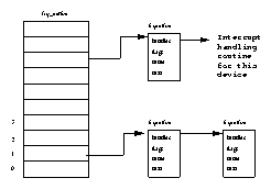 When the interrupt happens, Linux must first determine its source by reading the interrupt status register of the system's programmable interrupt controllers. It then translates that source into an offset into the irq_action vector vector. So, for example, an interrupt on pin 6 of the interrupt controller from the floppy controller would be translated into the seventh pointer in the vector of interrupt handlers. If there is not an interrupt handler for the interrupt that occurred then the Linux kernel will log an error, otherwise it will call into the interrupt handling routines for all of the irqaction data structures for this interrupt source.