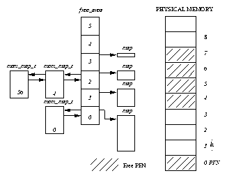 Figure free-area-figure shows the free_area structure. Element 0 has one free page (page frame number 0) and element 2 has 2 free blocks of 4 pages, the first starting at page frame number 4 and the second at page frame number 56.