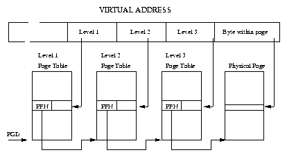 Linux assumes that there are three levels of page tables. Each Page Table accessed contains the page frame number of the next level of Page Table. Figure 3.3 shows how a virtual address can be broken into a number of fields; each field providing an offset into a particular Page Table. To translate a virtual address into a physical one, the processor must take the contents of each level field, convert it into an offset into the physical page containing the Page Table and read the page frame number of the next level of Page Table. This is repeated three times until the page frame number of the physical page containing the virtual address is found. Now the final field in the virtual address, the byte offset, is used to find the data inside the page.