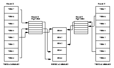 Figure 3.1 shows two processes that each share physical page frame number 4. For process X this is virtual page frame number 4 whereas for process Y this is virtual page frame number 6. This illustrates an interesting point about sharing pages: the shared physical page does not have to exist at the same place in virtual memory for any or all of the processes sharing it.