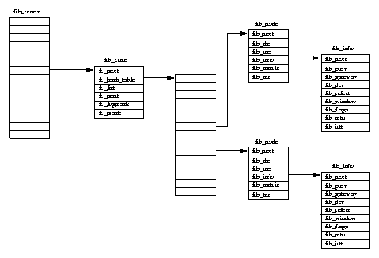 Each IP subnet is represented by a fib_zone data structure. All of these are pointed at from the fib_zones hash table. The hash index is derived from the IP subnet mask. All routes to the same subnet are described by pairs of fib_node and fib_info data structures queued onto the fz_list of each fib_zone data structure. If the number of routes in this subnet grows large, a hash table is generated to make finding the fib_node data structures easier.