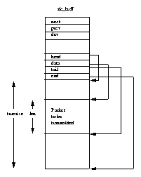 One of the problems of having many layers of network protocols, each one using the services of another, is that each protocol needs to add protocol headers and tails to data as it is transmitted and to remove them as it processes received data. This make passing data buffers between the protocols difficult as each layer needs to find where its particular protocol headers and tails are. One solution is to copy buffers at each layer but that would be inefficient. Instead, Linux uses socket buffers or sk_buffs to pass data between the protocol layers and the network device drivers. sk_buffs contain pointer and length fields that allow each protocol layer to manipulate the application data via standard functions or ``methods''.