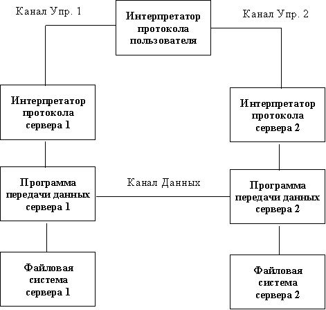 Возможна ситуация, когда данные могут передаваться на третью машину. В этом случае пользователь организует канал управления с двумя серверами и организует прямой канал данных между ними. Команды управления идут через пользователя, а данные напрямую между серверами (рисунок 4.3).