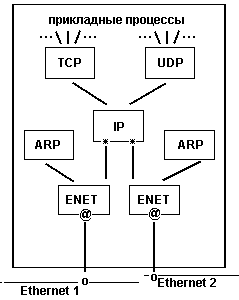 Рис.3. Узел сети TCP/IP с двумя сетевыми интерфейсами.