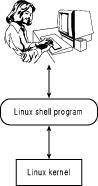 The shell is a program used to interface between you (the user) and Linux (or, more accurately, between you and the Linux kernel). Figure 10.1 illustrates the relationship between the user, the shell, and the Linux kernel. Every command you type at a prompt on your screen is interpreted by the shell, then passed to the Linux kernel.