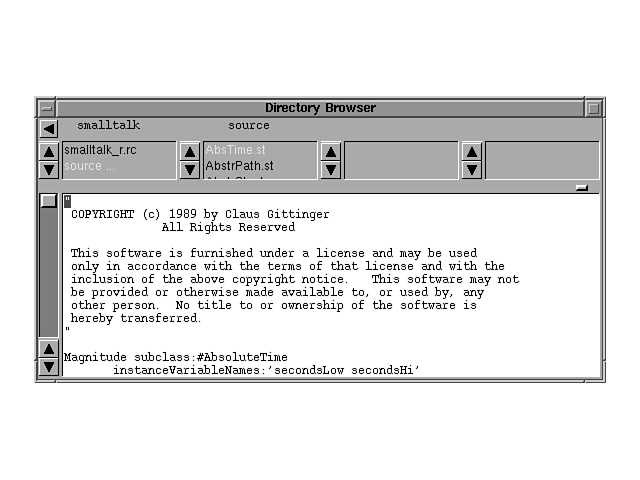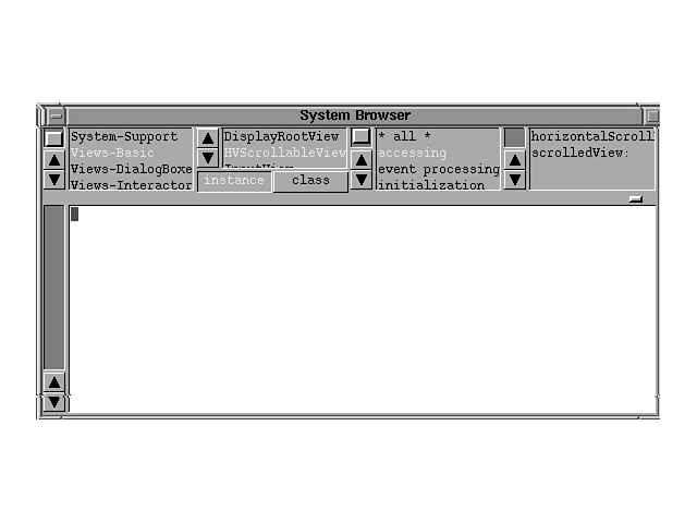 Figure 34.3. Within the ST/X system, classes are assigned to a category. A category is simply an attribute used for grouping classes to make them easier to handle. To select a class category, click on the name of the category in the class category list. This is the leftmost section of the top half of the System Browser. This will display, in the class list subview, all classes belonging to that category. The class list subview is the second section from the far left of the system browser. You can also select one of two special categories: * all *, which selects all classes and lists them alphabetically; and * hierarchy *, which lists all classes in a tree by inheritance.
