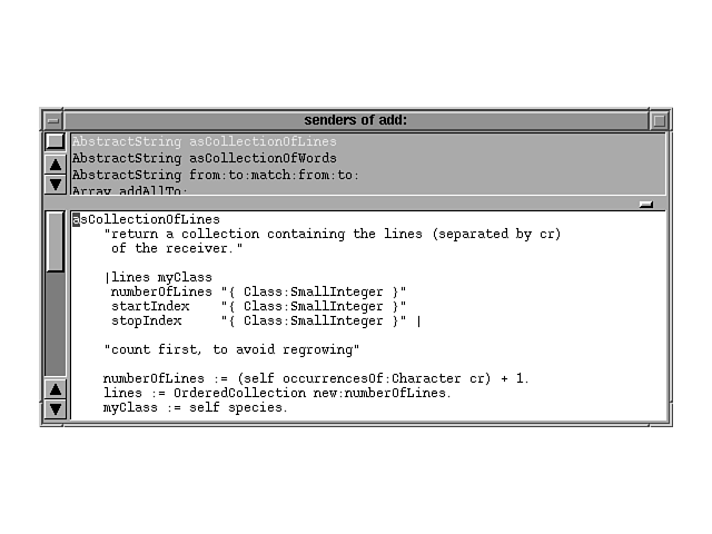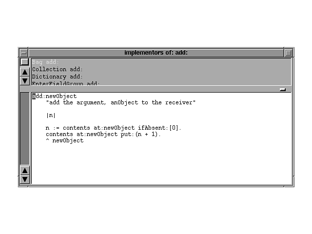 The Implementors view contains a list of the methods that implement the method specified by the selector. The pop-up menu for the top half of the Implementor view is the same as the pop-up menu for the method list subview which was discussed in the "System Browser" section of this chapter.