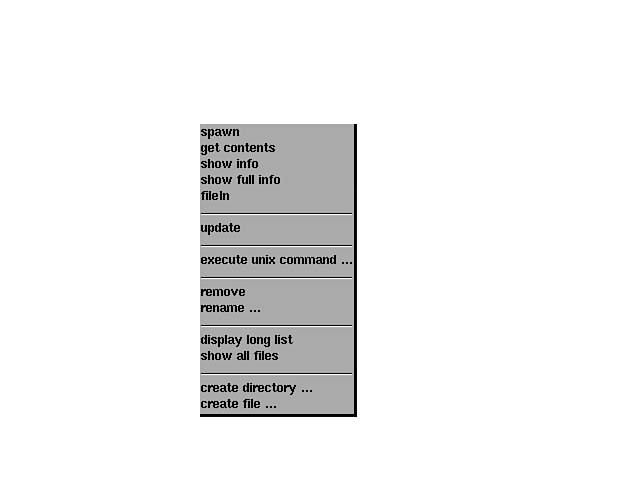 To inspect the contents of a file, double-click the left mouse button on the name of the file in the file list. To change directories, double-click on the directory name. Directory names are always shown in the file list.
