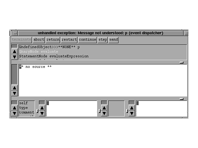 A miniDebugger is entered if an error occurs within the Debugger itself. This is a line-by-line debugger that allows limited debugging without the use of a graphical user interface. It is controlled by entering commands in the Xterm window where ST/X was started. If you type ? at the miniDebugger prompt, you will get a list of commands that are available for use in this stripped down debugger.