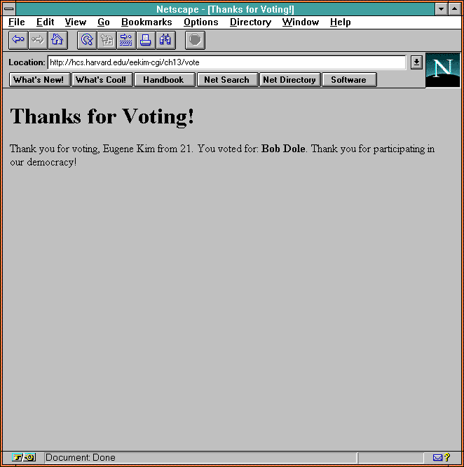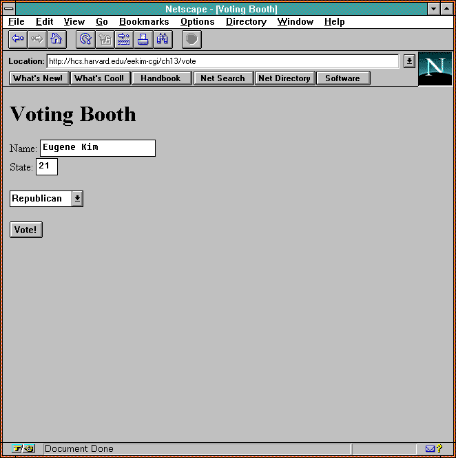 The entire application, called vote, is shown in Listing 13.3. When you first run this application, you see the form in Listing 13.1. Suppose you type the information depicted in Figure 13.1. Because you entered Republican as your party affiliation, vote returns a Republican ballot, as shown in Figure 13.2. After you make your selection, a confirmation message like the one in Figure 13.3 appears.