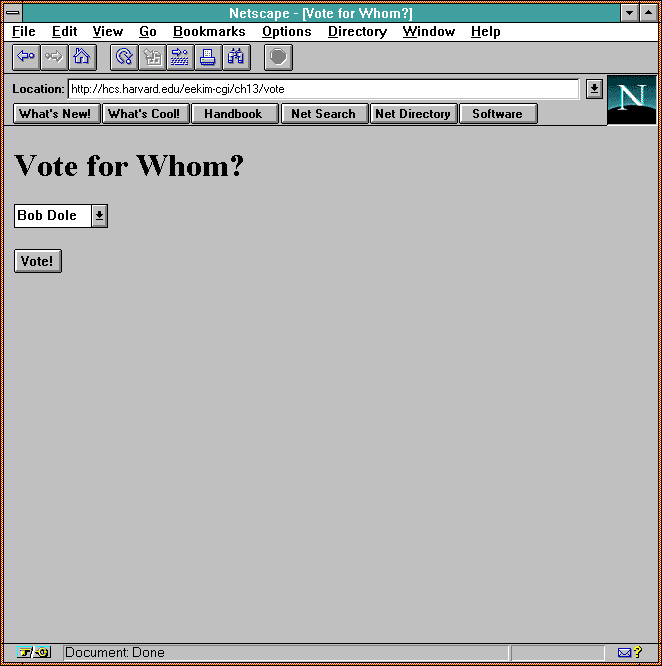 <html> <head> <title>Vote for Whom?</title> </head> <body> <h1>Vote for Whom?</h1> <form method=POST> <input type=hidden name="nextpage" value="three"> <select name="candidate"> <option>Bill Clinton <option>Donkey </select> <p><input type=submit value=\"Vote!\"></p> </form> </body> </html>
