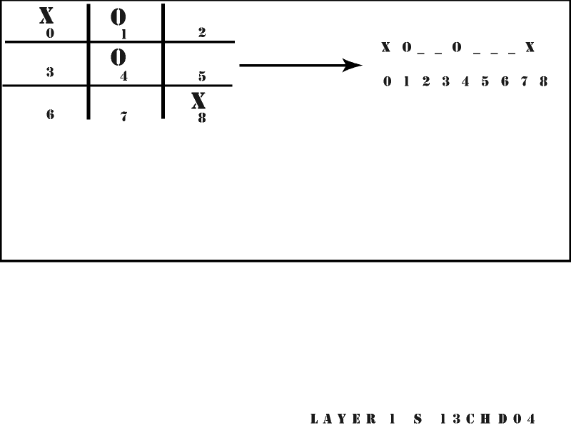 The program needs some method of passing the state of the previous board to the next board. The state of the board is easily expressed as a nine-character string with the first three characters representing the top row, the second three characters representing the middle row, and the last three characters representing the final row (see Figure 13.4). The program only needs this one string, and it is not likely that a user will need to maintain state over different sessions. Therefore, using a session file to pass state is overkill.