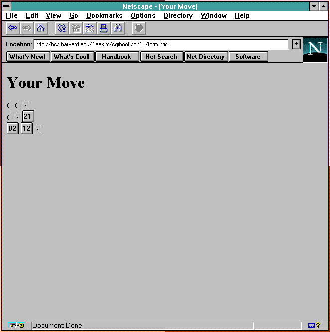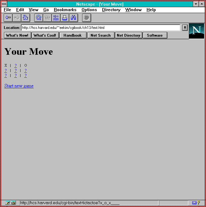 In order to demonstrate another application of state, I wrote a Tic-Tac-Toe game. Tic-Tac-Toe is a simple game, and yet it is not trivial to implement as a CGI program. It presents several challenges, among them, presenting a board, accepting the player's move, and maintaining state.