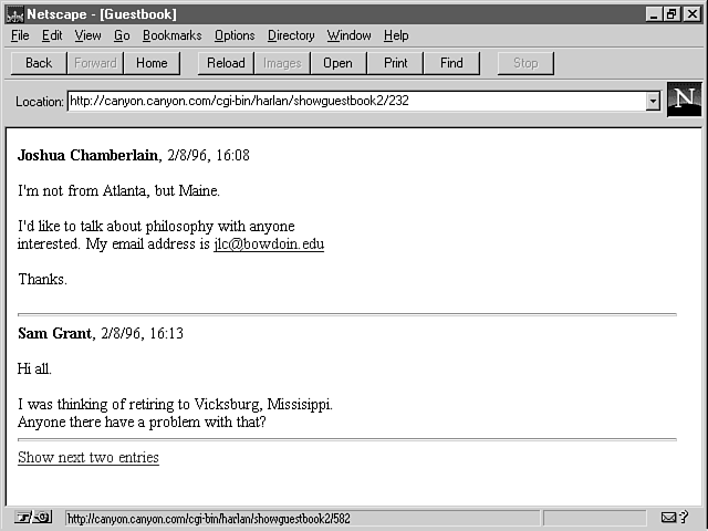 If, for example, you want to display only x number of lines on any given page and limit the total number of entries in the file, the result would look like figures 2.4, 2.5, and 2.6. Figure 2.4 shows the result of the initial call to this new script. Figure 2.5 shows the page that is returned after the user selects the Show next two entries link in figure 2.4. The URL in the Location box in figure 2.6 also has a number, but the text does not include a Show next... link.