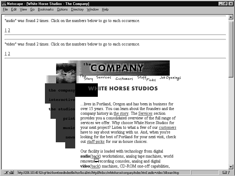 As in the nonindex search described earlier in this chapter, I want to be able to show the user where her search terms occurred in the returned documents. Unfortunately, I can't use the same showfoundfile script, because in the index search, the search string is interpreted as a list of words, rather than a single phrase. When a user executes a search and selects a file from the resulting list, figure 5.4 shows what she would see.